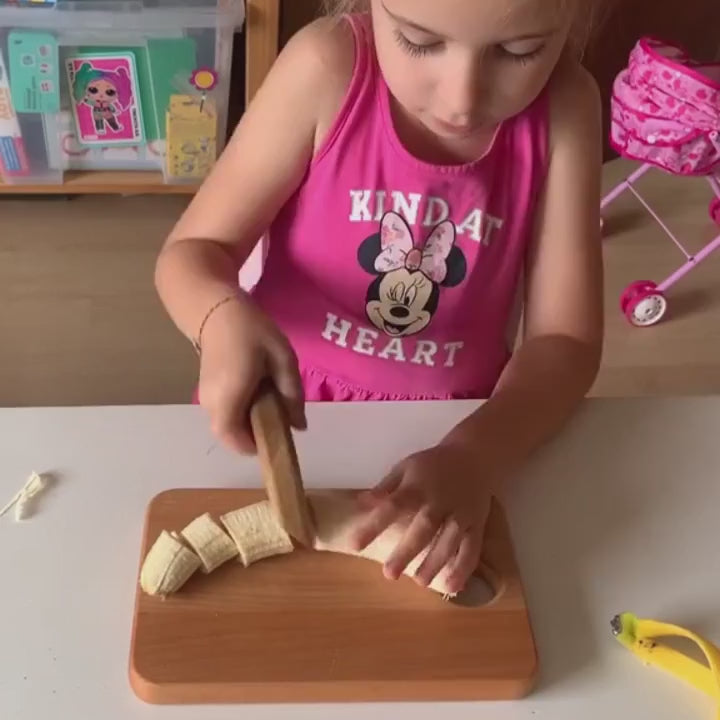 Vos enfants pourront trancher des légumes, fruits, fromages, gâteaux, et même du pain tendre.
